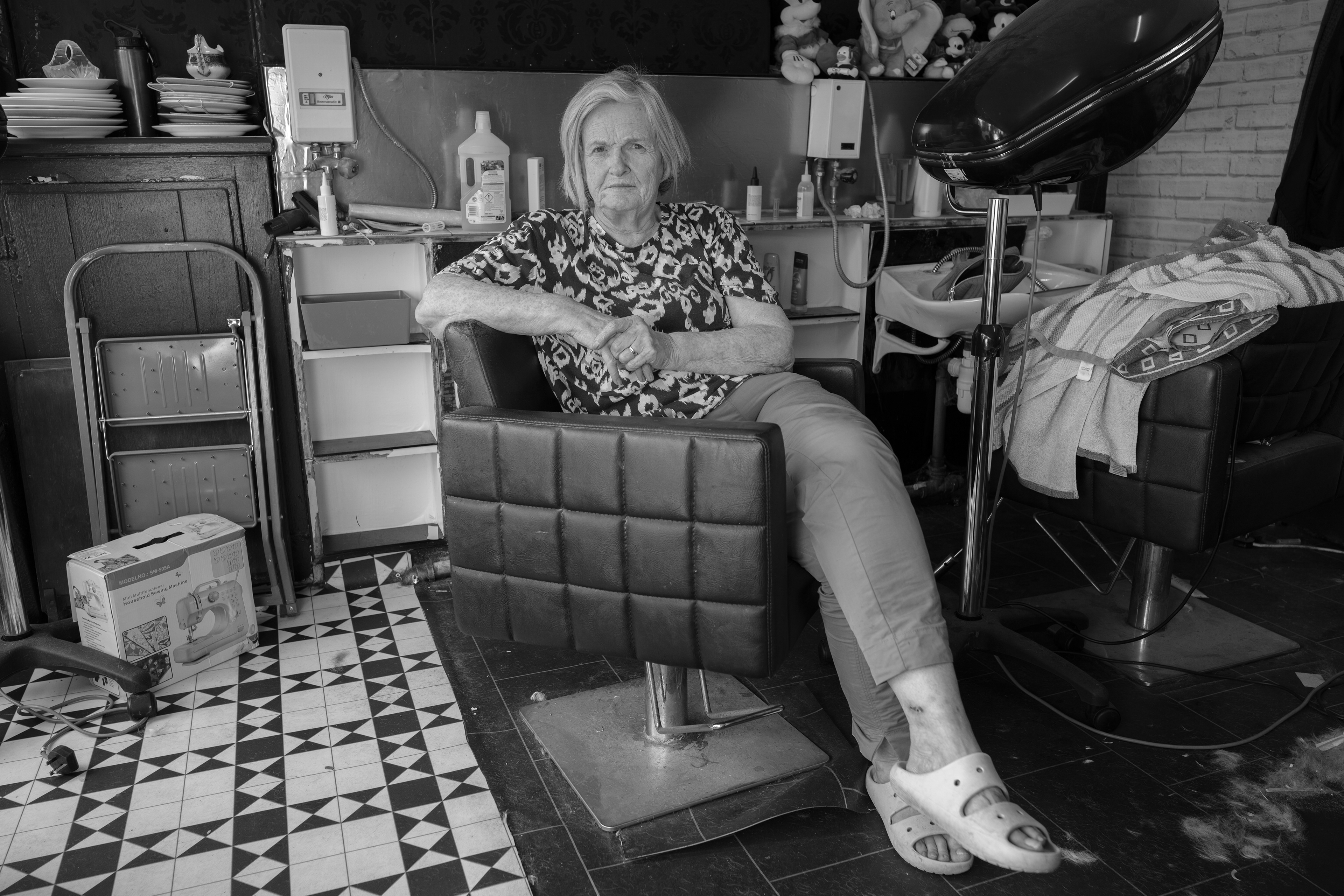 Glynis (2025) - Glynis pictured here on a break while clearing out her hair salon business, which she has had to retire from after 28 years of serving the Firswood community. Rent rises have forced her to close, and she has retired to Urmston. Firswood is an area in Old Trafford, Manchester.