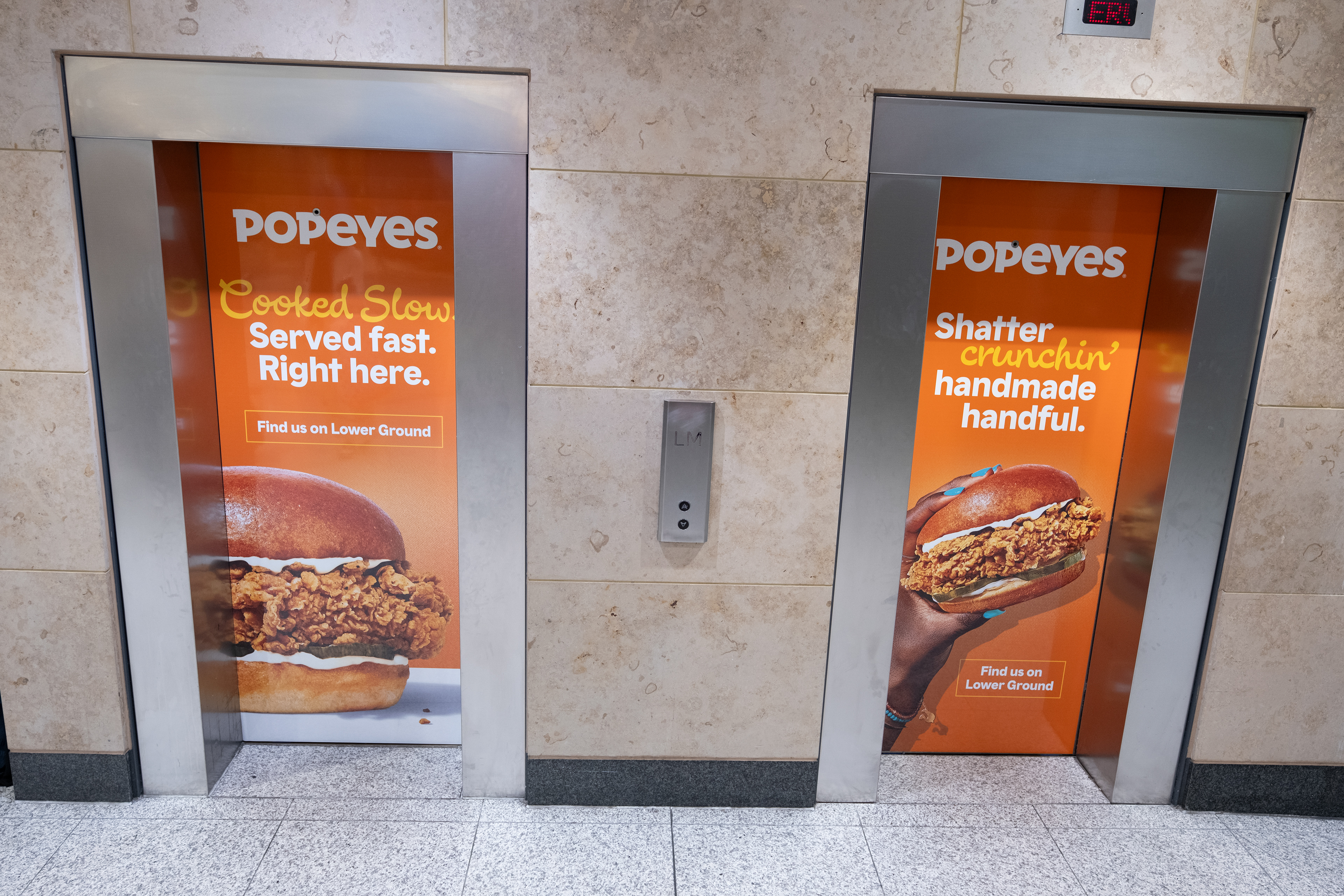 Popeyes New Chicken Restaurant - Arndale Centre Manchester August 2025 - OOH Lift/Elevator wraps
